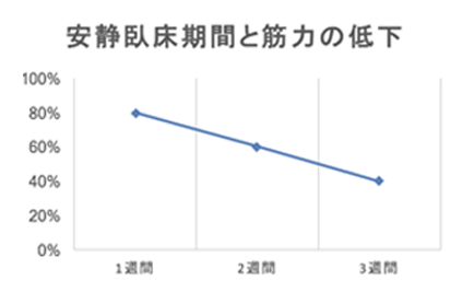 筋力の場合、1週間の安静では約15%、1ヶ月では50%もの筋力低下が起こります。一度落ちた筋力をもとに戻すには2倍の時間が掛かるとされています。特に高齢者の場合、元々の筋力が落ちているため、余計に注意が必要です。