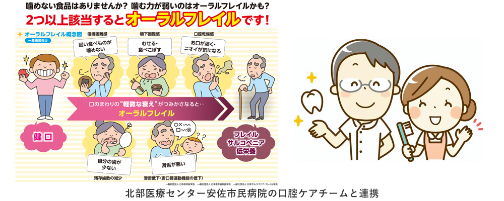 飲み込みに問題がある方に対して歯科医、医師、歯科衛生士、看護師、放射線検査技師、言語聴覚士で一体となって口腔内の機能チェック、食事や水分の嚥下評価を行っています。