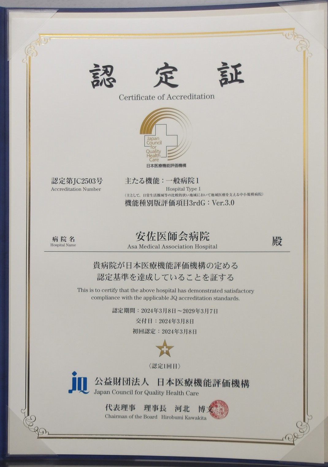 開設後も継続して受審準備を進め、令和5年12月に訪問審査を受け、令和6年2月下旬に評価Cの項目は無い旨の中間的な結果報告を受けた後、令和6年3月8日付けで病院機能評価に係る一般病院1の認定病院となりました。
