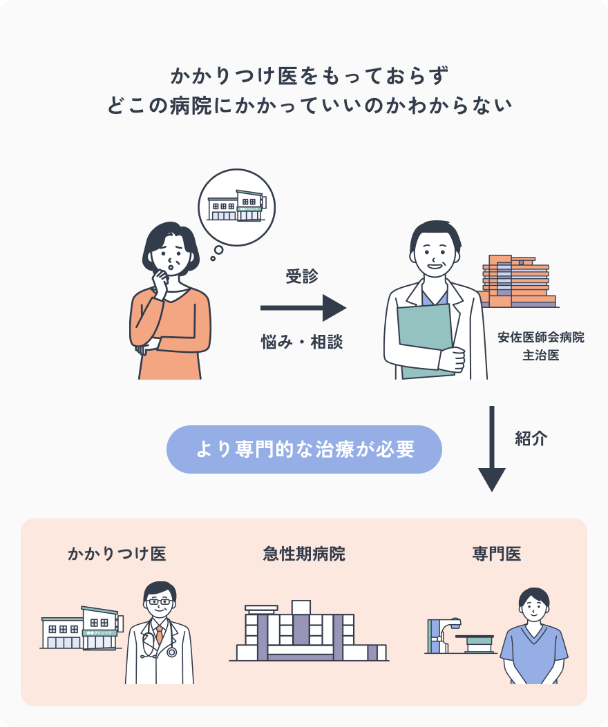 当院での診察後には、必要に応じてかかりつけ医をご紹介します。さらに、より専門的な治療が必要な場合には、総合病院や専門病院をご紹介します。