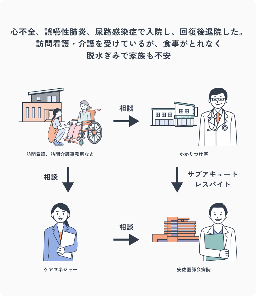 在宅で療養中の方を中心に、高度急性期に行くほどではないが入院して治療が必要(サブアキュート)、ご家族の都合で1週間程度入院させてほしい(レスパイト)などのご要望をお受けします。